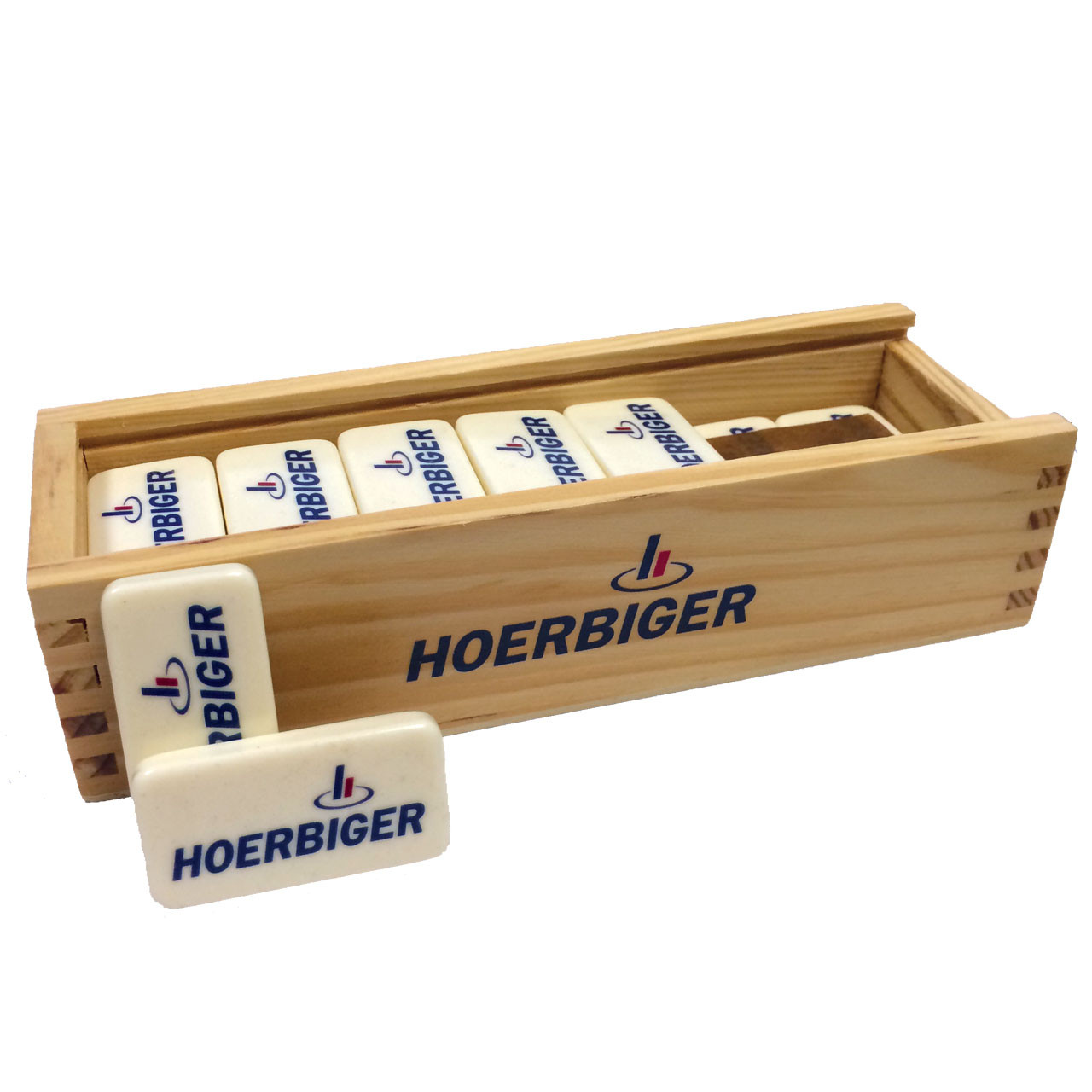 Double 6 Domino Set in a slide-open box. Contains 28 ivory-colored dominoes with black dots.
