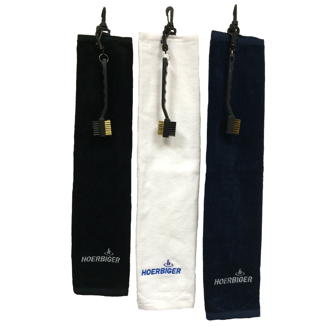 Cotton golf towel with detachable wire scrub brush and snap hook fastener.