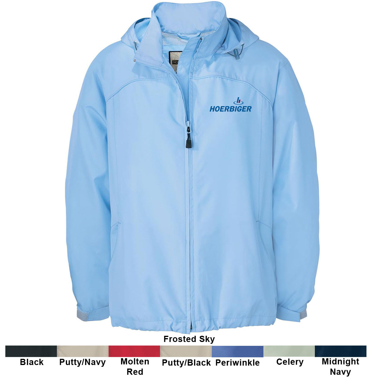 Mid-length jacket. Attached lined hood that can be rolled into collar. Contour seam detailing. Piped yoke. Vented horizontal back yoke. Shock cord drawstring at hem. Elasticized cuff band with adjustable tab closure. EZEM system®. Easy care.