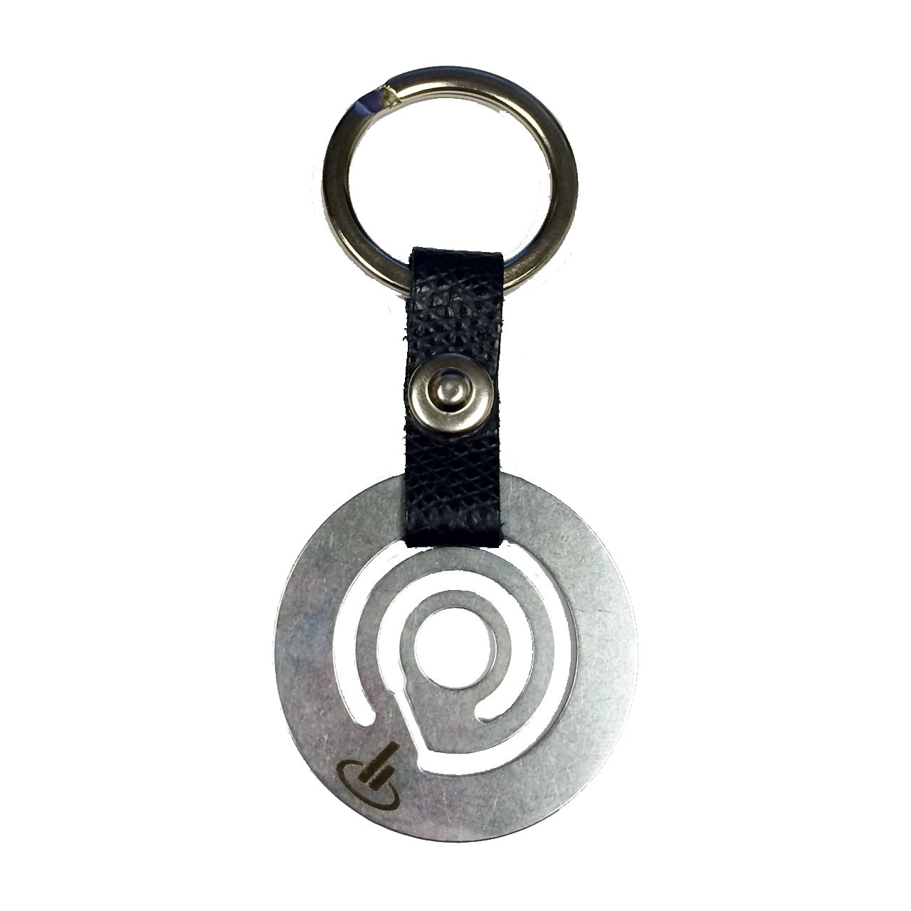 Round valve plate key ring with black strap.